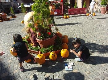 園内にたくさんあるカボチャの数と入園口にある大きなカボチャの重さを当てて、