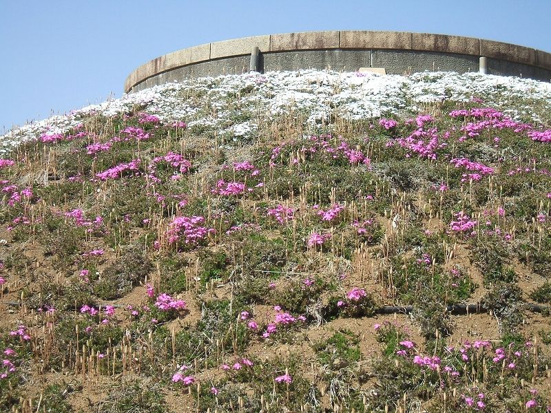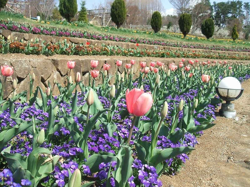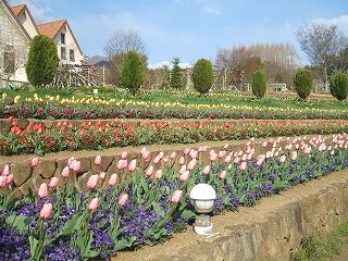 パノラマ花壇ではピンクと黄色のチューリップが咲いています。