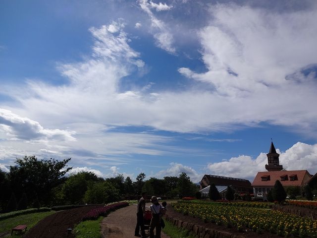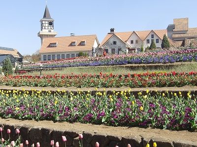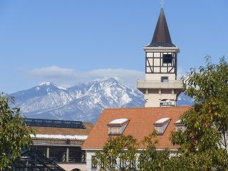園内独特のスイスの街並みと、南アルプスの山々を横目に