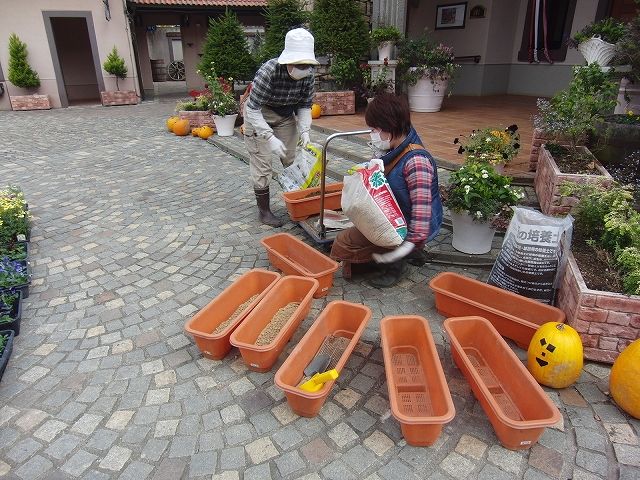 今日は他にも気になる作業をしている可愛い女子を見つけました。冬の時期に備えてギャザリングの植え替えをしている真っ最中!
