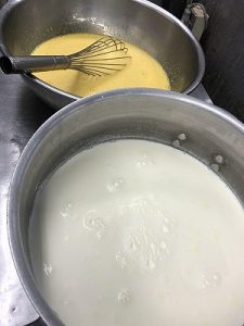 大きなボールにたまごと温めた牛乳、 生クリームをよく混ぜ合わせて
