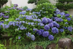 曇りや雨の天気に雫をまとったカラフルな紫陽花は草木の緑が濃くなったこの時期に