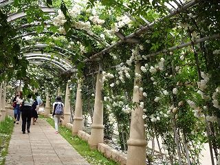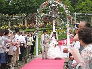 バージンロードの赤、芝生の緑、そしてカラフルなバラ。