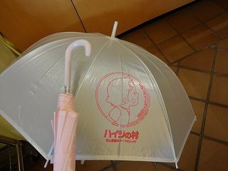 2013年06月20日 アンブレラ 公開済み: 2013年6月20日更新: 2013年6月20日作成者: ハイジの村カテゴリー: blog 今日はあいにくの雨。 こんな日に欠かせないものといえば、傘ですね。 英語では、アンブレラです。 ハイジの村ではかわいい傘を売っています。 ハイジの横顔がプリントされていて、 色は白とピンクの二種類。 大きめの傘です。 来村の記念にもなり、1年中使えるので お土産にもおすすめです。 カウベル・カフェ、ハイジのテーマ館、 ハイジの隠れ家にて販売中です。 ハイジの柄の傘をさして、 雨に濡れたバラを眺めるのも 素敵ですね。 今日の園内のバラの様子はこんな感じです。 まゆ