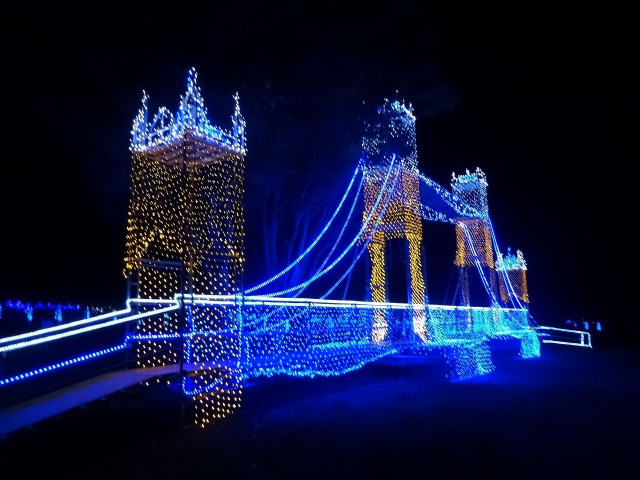 2013年10月28日 イルミネーション 公開済み: 2013年10月28日更新: 2013年10月28日作成者: ハイジの村カテゴリー: blog 昨夜、園内を見渡すとキラキラと イルミネーションで輝いていました。 ブライダルフェアのために点灯させたのです。 12月から夜間営業が始まるので 一足早くイルミネーションを見れて 凄く得をした気がします。 先日、ようこさんがロンドンブリッジの事について 書いていたのでついシャッターをおしてしまいました。 思わず「きれーい。」とさけんでしまった私、 お客様の反応がますます気になります。 めぐ