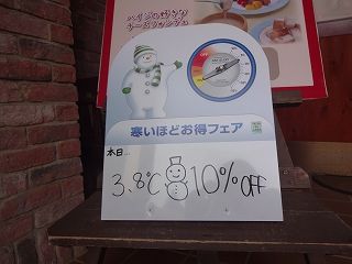 2014年02月02日 寒いほどお得フェア 公開済み: 2014年2月2日更新: 2014年2月2日作成者: ハイジの村カテゴリー: blog あっという間に1月も終わり 昨日から寒いほどお得フェアが始まりました。 2月28日(金)までの毎朝午前10時の 気温で値引きが変わります。 その日その日によって違うので 今日は何度かなー。というワクワクがあるので 私は毎朝楽しみです。 レストランボルケーノの ハイジの好きなチーズフォンデュ(2名様より)と オムライス(サラダ・スープ付)が対象商品です。 ちなみに今日の気温は 3.8℃なので10%OFF。 嬉しいなーー。 めぐ