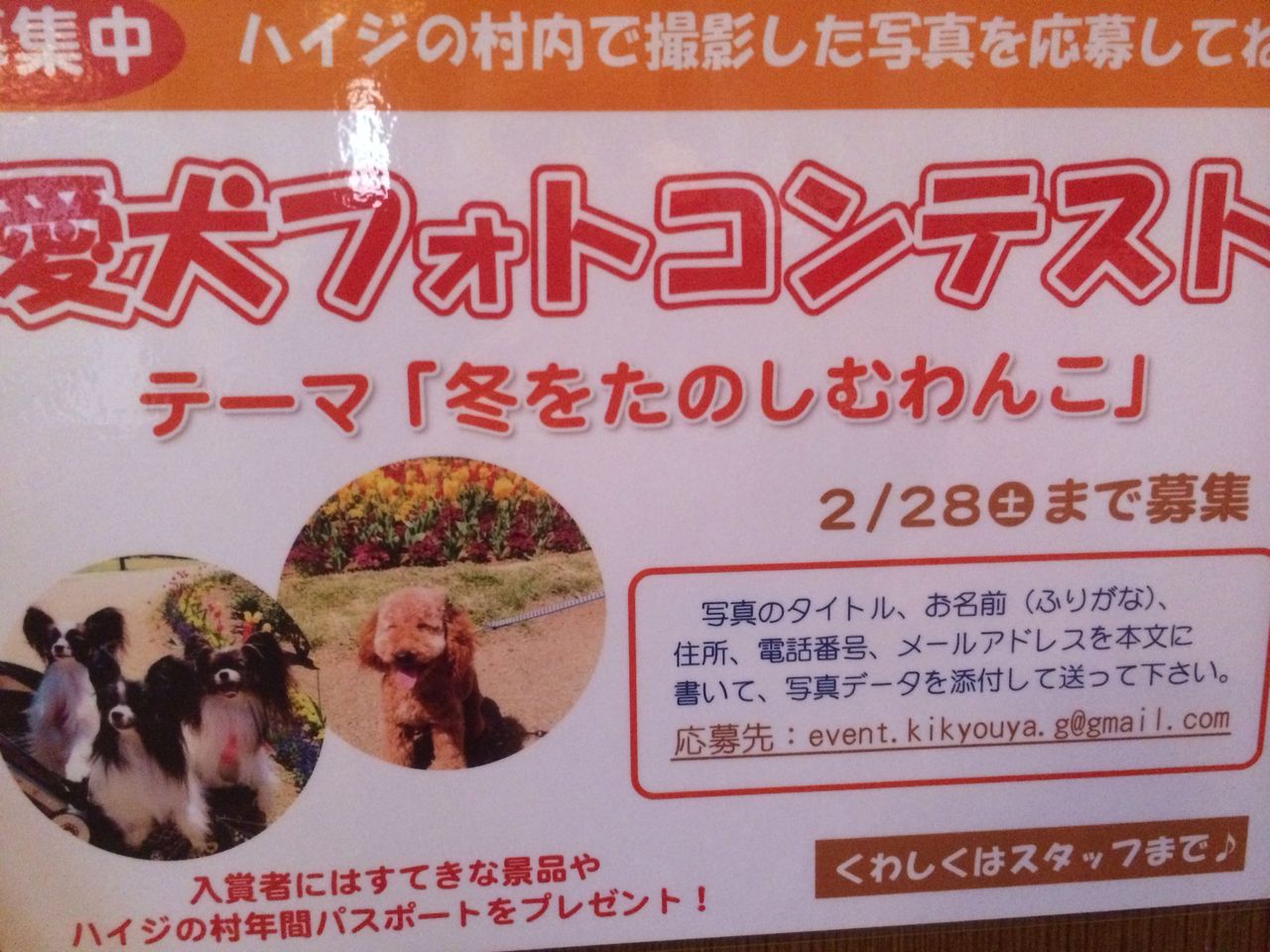 2015年02月23日 愛犬 公開済み: 2015年2月23日更新: 2015年2月23日作成者: ハイジの村カテゴリー: blog 今日は日がさして とても暖かいですね。 レストランボルケーノの愛犬テラスでは ワンちゃんもうとうとしてしまうほど暖かい。 そんな可愛いワンちゃんを見て お客様につい愛犬フォトコンテストを お勧めしてしまいました。 テーマは『冬をたのしむわんこ』 可愛いワンちゃんの写真が沢山集まって スタッフは入選者選びで悩んでしまいます。 募集の期限は2月28日までです。 家にいるのはもったいないほどの ワンちゃんにとっての散歩日和。 ハイジの村でワンちゃんと共に 冬を存分に楽しんで下さいね。 めぐ
