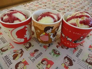 2015年04月18日 ヤギミルクアイス 公開済み: 2015年4月18日更新: 2015年4月18日作成者: ハイジの村カテゴリー: ロッテンマイヤーズカフェ 4月17日からロッテンマイヤーズカフェで、 ヤギミルクアイスクリームが新しくなりました。 以前は、プラスチックのカップに入れて販売していたのですが 陶器のカップに入れての販売に変わりました。 ヤギミルクアイスとブルーベリーソースの愛称がバツグン。 おひとつ¥445(税込¥480)です。 陶器のカップの絵柄はとことこ、ハイジとヨーゼフ、ハイジの横顔の3種類です。 どの絵柄が当たるかはお楽しみに。