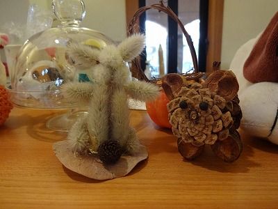 2015年09月16日 自然の素材で 公開済み: 2015年9月16日更新: 2015年9月16日作成者: ハイジの村カテゴリー: blog 美しい自然に囲まれているハイジの村。 そんな園内で見つけた木の実や葉っぱを使って、手作りのハロウィンの飾りを作っています。 可愛らしいリースには松ぼっくりのワンちゃんがいたり、 店内ではワンちゃんやウサギちゃんがお客様をお出迎え。 入園口やお店の入り口には、木の実をいっぱい入れたカゴがあって 木の実のはずなのに、なんだかとっても美味しそう。 そんな食欲の秋をも感じさせる作品の数々は、ハイジの村だけでなく、クララ館やペーター館にも飾ってあるので、見つけてみてくださいね。 みさ