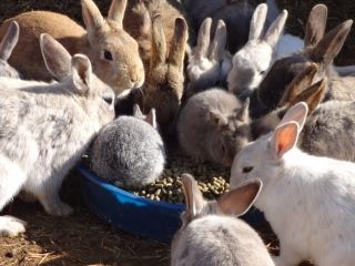 数匹固まってたり、小屋の隅に1匹でいたり、屋根の上でのびのびしていたり。子ウサギも親らしきウサギにベッタリくっついている子もいれば子ウサギ同士で集まってたり。