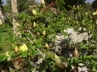 2016年04月26日 三週間早く… 公開済み: 2016年4月26日更新: 2016年4月26日作成者: ハイジの村カテゴリー: blog 数日前は天気も安定せず肌寒い気温が続いていましたが、暖かくなり今日はいい天気になりました。 ついにバラの時期がやってきました。今年初めてのバラ、カナリバードがローズガーデンに咲きました。 黄色い小さくとても可愛らしいこのバラはハイジの村にあるバラの中では一番早く咲くバラでいつもより三週間早く花が開いたそうです。 まだまだつぼみがたくさんありましたが、がくが開いている状態になると二、三日で咲く合図らしいので早く満開のバラが見れるのか楽しみです。 やの