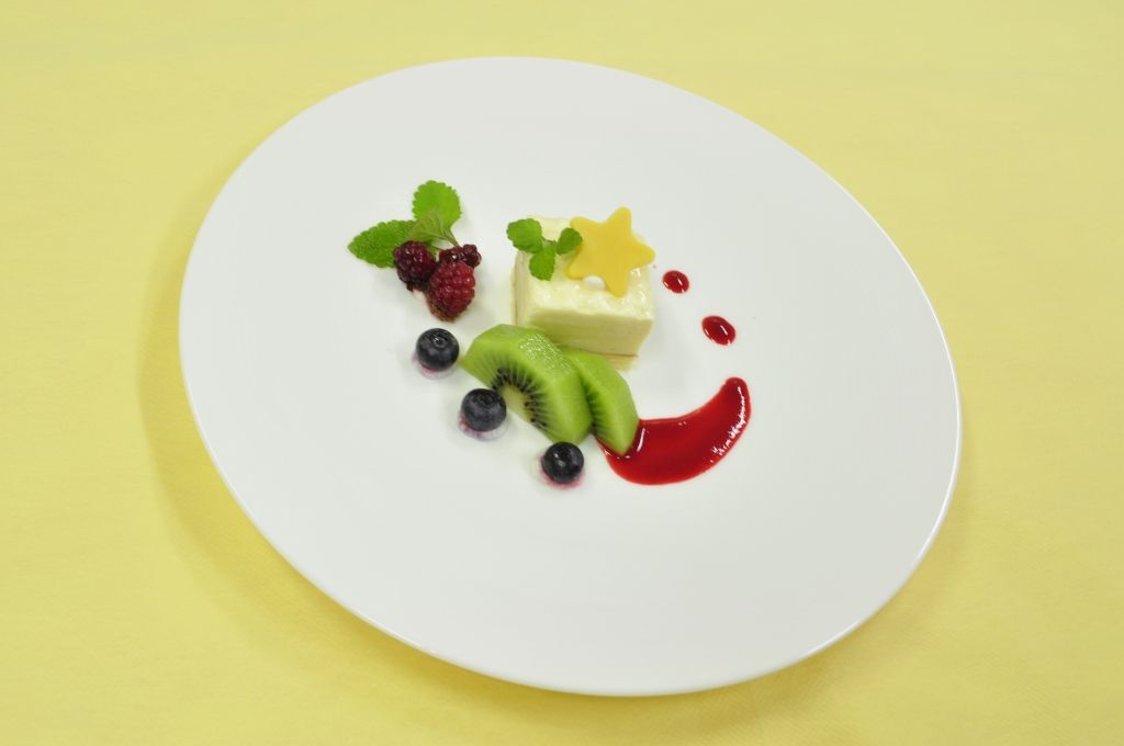 鳥との争奪戦に勝ち、収穫できたブルーベリーとブラックベリーは、レストランボルケーノのコース料理のデザートに添えられています。