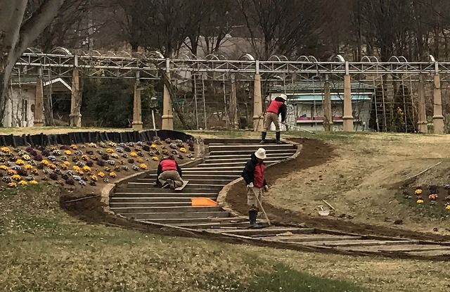 揺れる花々を植える階段の改装を行っています。