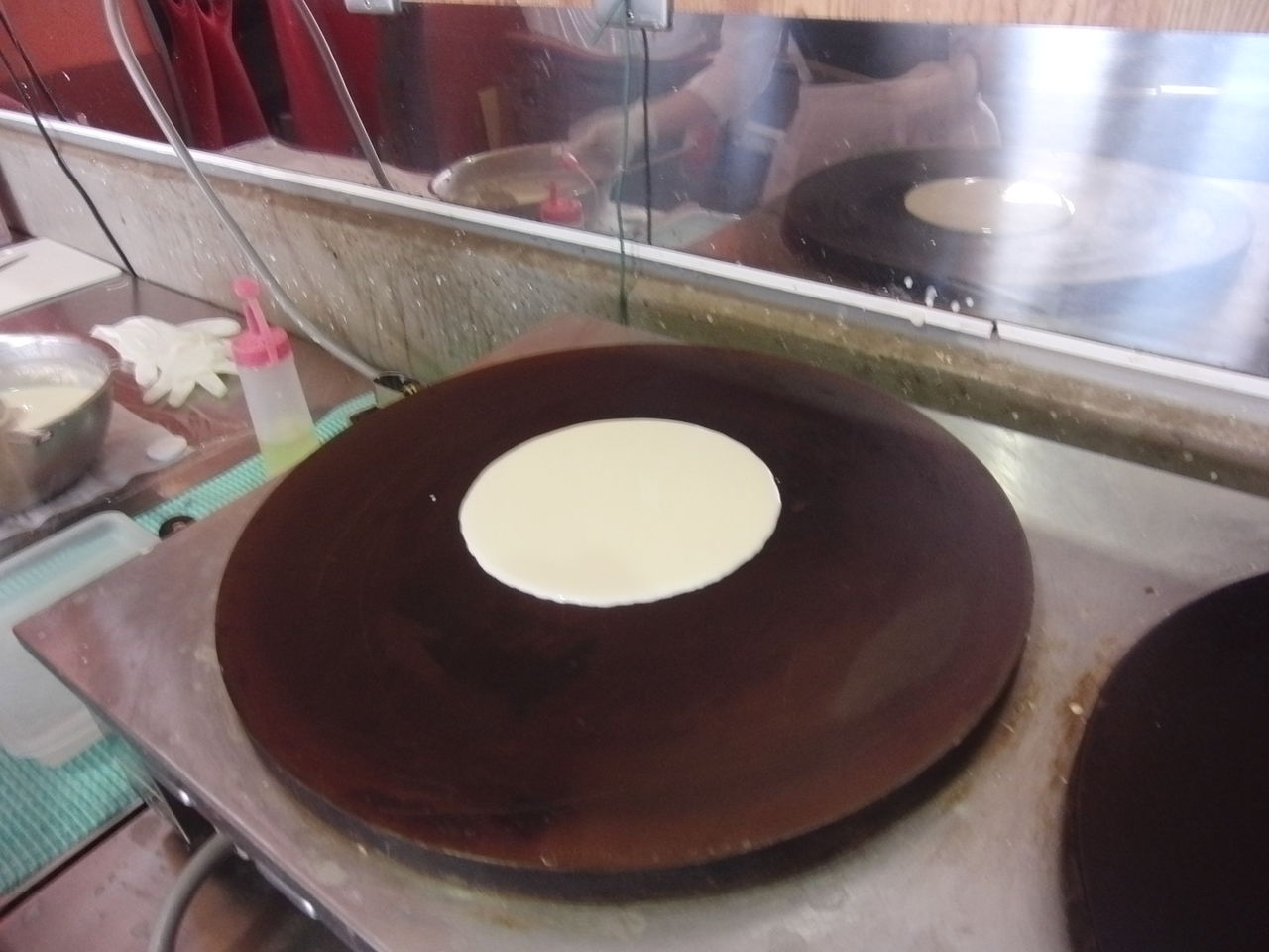 まずは鉄板の上にクレープを流して…クルッと…な…?