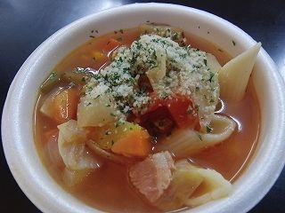 温かいスープの中には、19種類の野菜とパスタが入っていて、