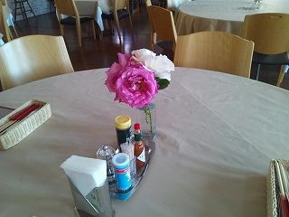 レストラン・ボルケーノでもお客様にバラを楽しんで頂こうと、卓上にバラを飾ることにしました。
