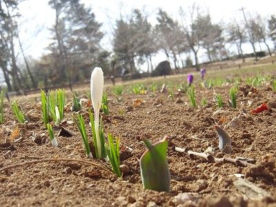 球根の殻を帽子みたいにかぶったチューリップの芽。